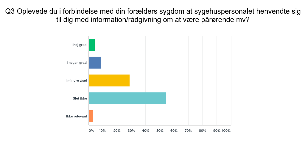 • 85 pct. af unge pårørende har ’slet ikke’ eller ’i mindre grad’ oplevet at sygehuspersonalet henvendte sig til dem med information/rådgivning om at være pårørende
