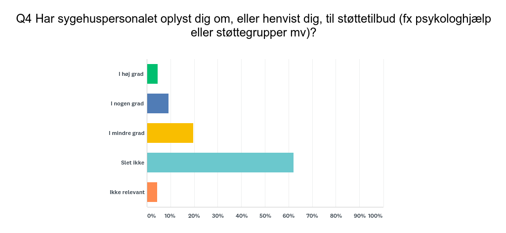 • 82 pct. har ’slet ikke’ eller ’i mindre grad’ oplevet at sygehuset har oplyst dem om eller henvist dem til  støttetilbud (fx psykologhjælp eller støttegrupper mv)
