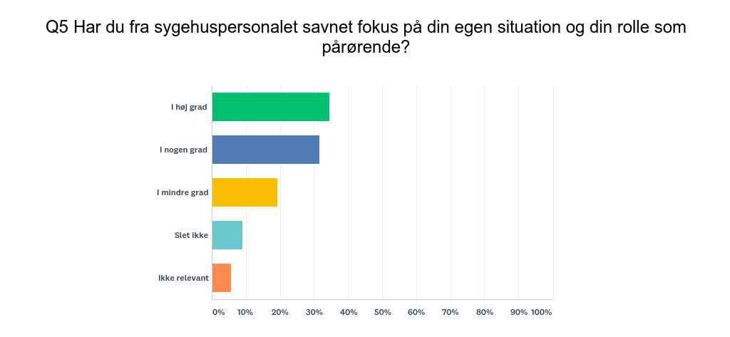 • 2 ud af 3 (66 pct.) af de unge har ’i høj grad’ eller ’i meget høj grad’ savnet fokus på deres egen situation og rolle som pårørende fra sygehuspersonalet