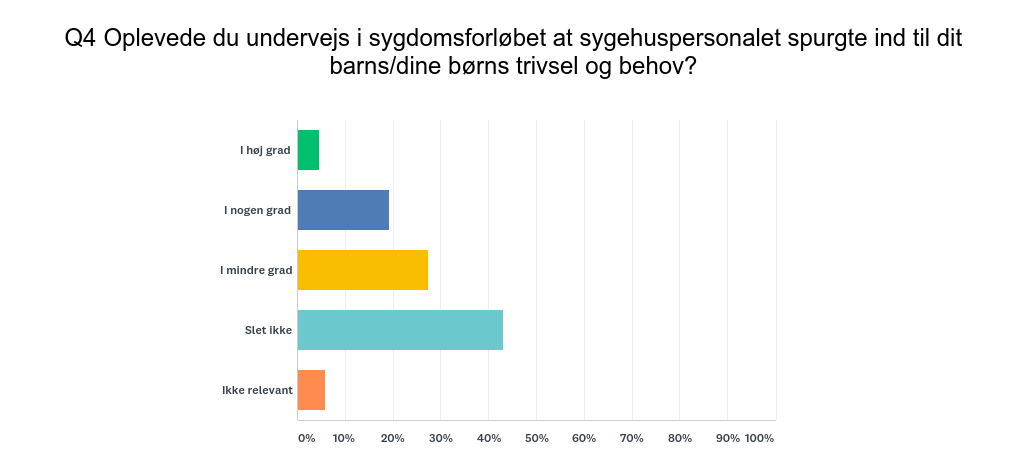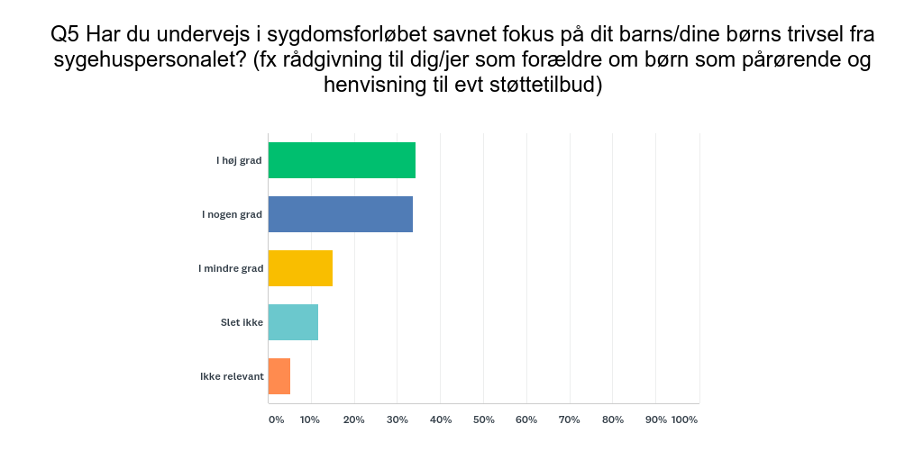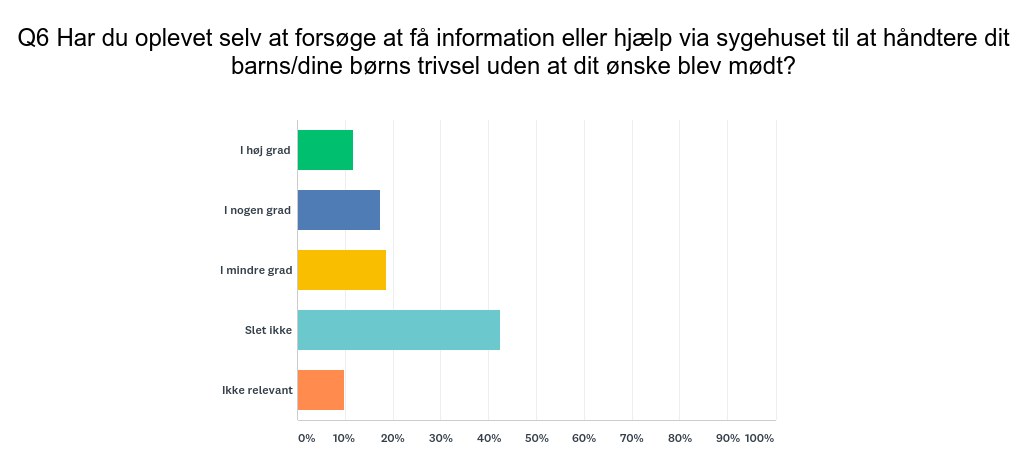 • 30 pct. af alle forældre har ’i høj grad’ eller ’i nogen grad’ forsøgt at få information eller hjælp fra sygehuset til at håndtere børnenes trivsel uden at blive mødt eller hjulpet