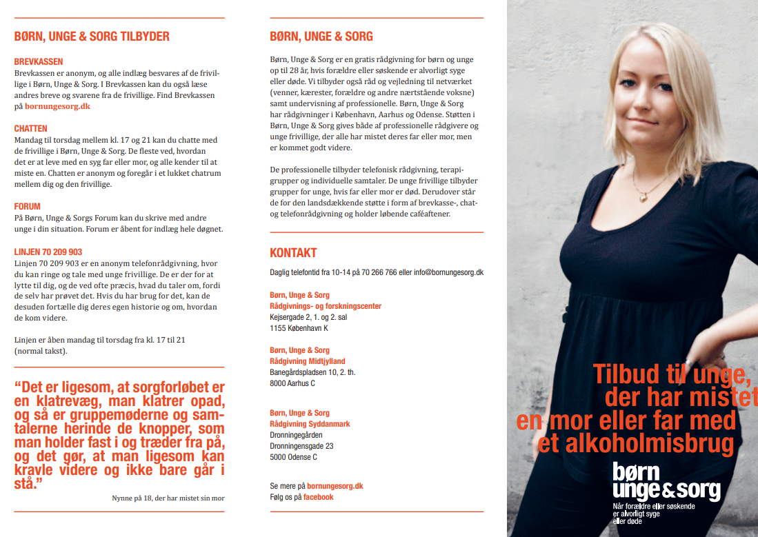 Det er ofte andre følelser og tanker, som gør sig gældende for disse unge end andre, der har mistet en forælder. Børn, Unge & Sorg i København har derfor oprettet to særlige tilbud om gruppeterapi til teenagere mellem 13-19 år og til unge mellem 20 og 28 år, som har mistet en far eller mor med et alkohol- eller stofmisbrug.