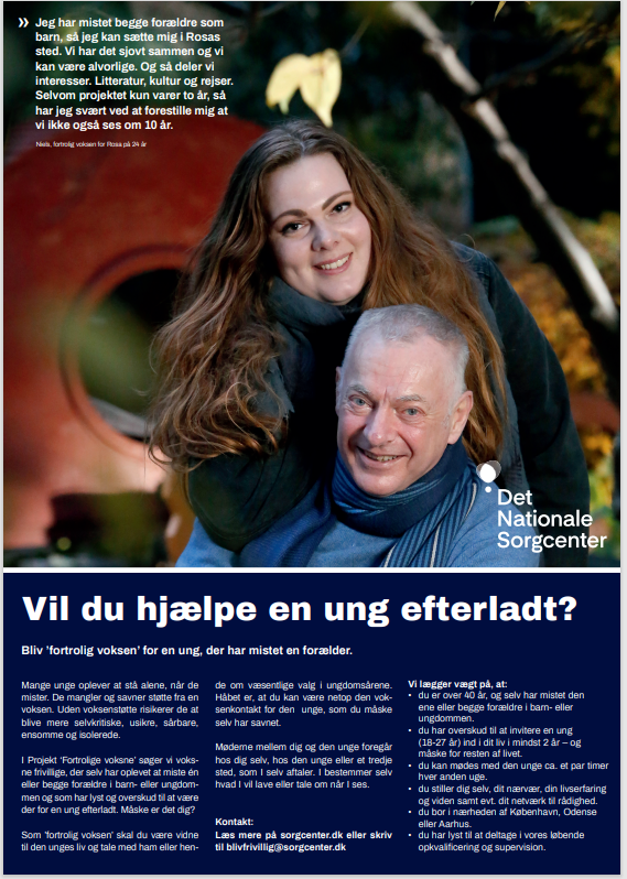 Det Nationale Sorgcenter startede i foråret 2019 et forløb op for unge efterladte, der mangler voksenkontakt. Vi søger derfor frivillige over 40 år, som selv har mistet en eller begge forældre i ungdomsårene; voksne som har overskud og lyst til at invitere en ung efterladt i alderen 18-27 år ind i deres liv i mindst 2 år – og måske resten af livet. Måske er det dig?